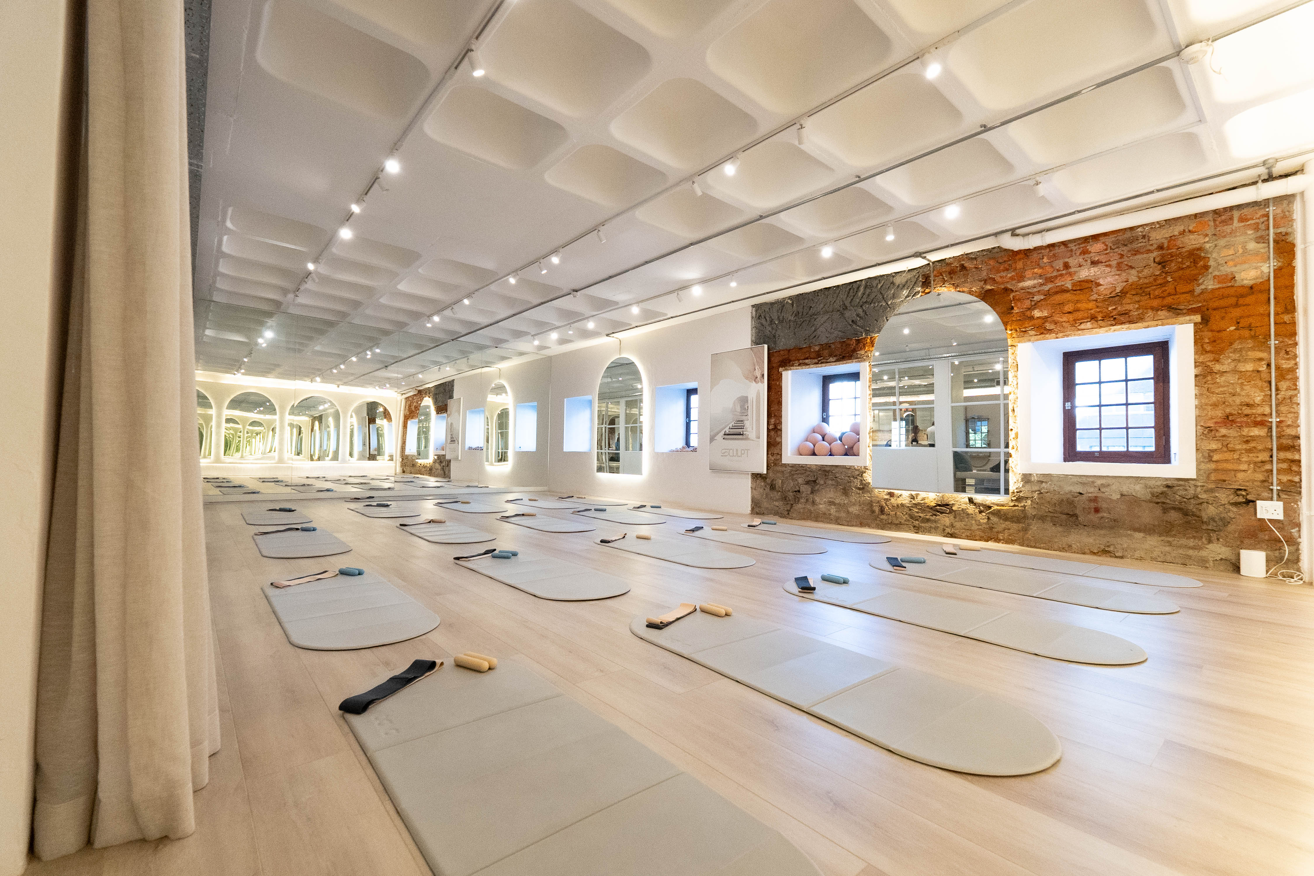 Bathed in natural light, our Mat Studio is a perfect blend of past and present. The exposed masonry walls hint at the building’s 300-year history, grounding your practice in a modern space with real soul. We host up to 20 mats per class, ensuring the room feels cosy but airy — giving you full range of movement, even with props, without the fear of getting a foot in your face.