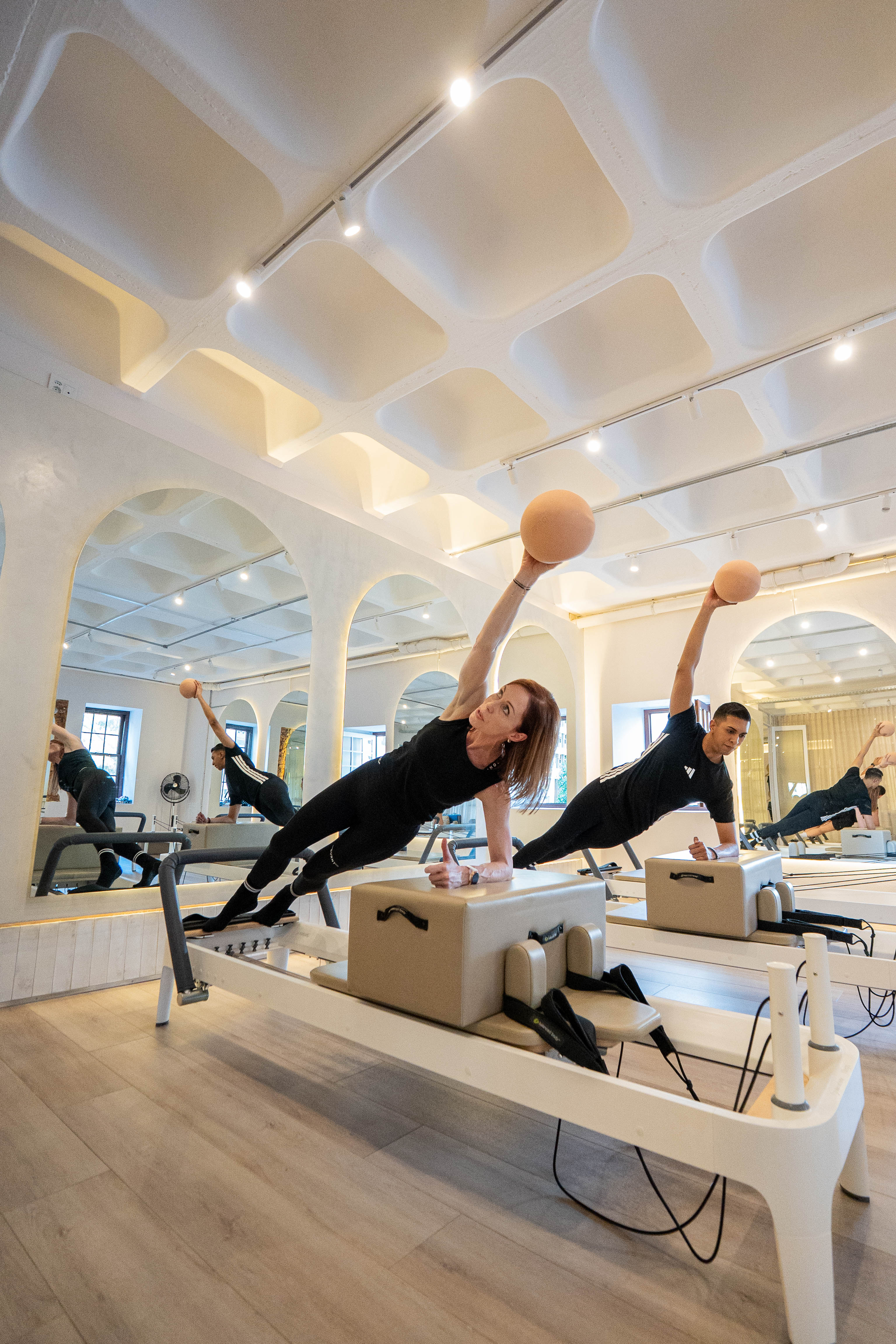We’ve capped the room at just 10 state-of-the-art Balanced Body Allegro 2 Reformers, because you deserve space to breathe and sweat (and cry tears of joy). Our custom arched mirrors and unique '360-view' pillar aren't just for checking your form — or your hair — they allow our instructors to navigate the floor with ease, ensuring you get those precise, personal adjustments that make all the difference.